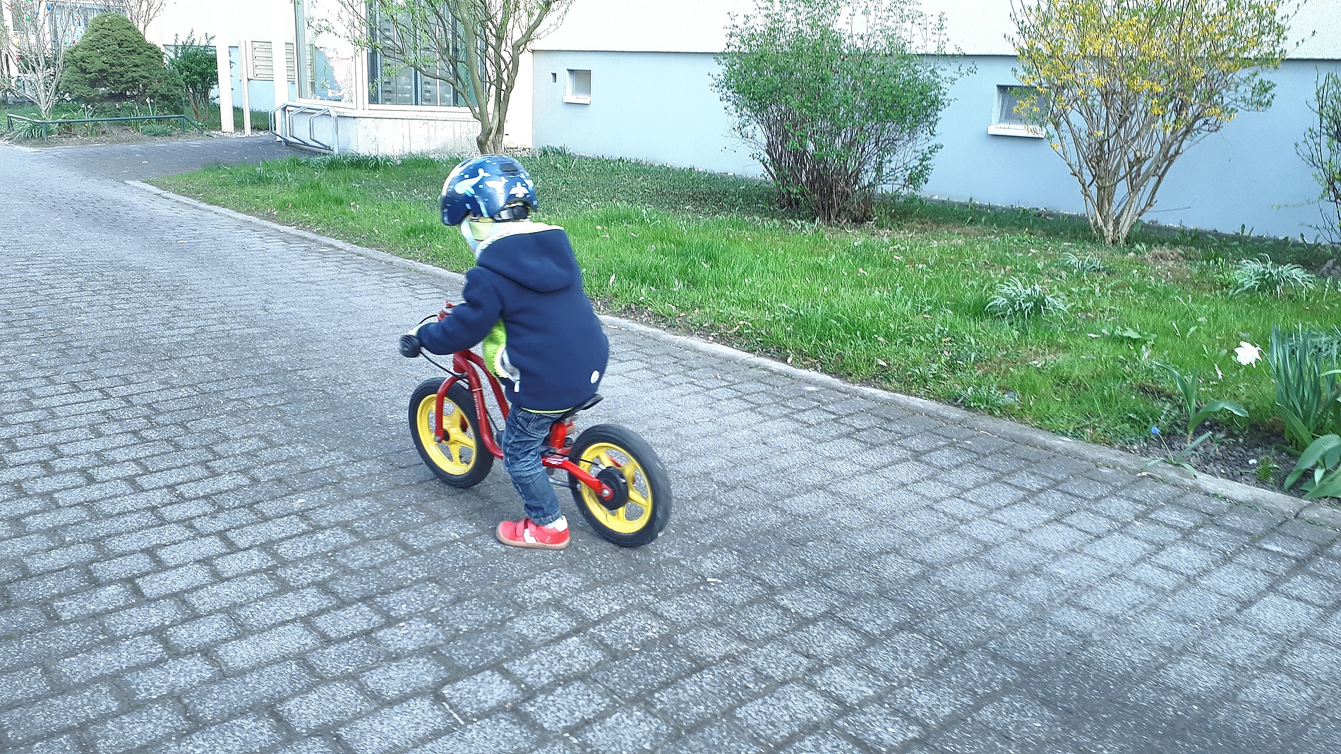 Der Junge ist schon wieder total überdreht und braucht noch Auslauf, muss nach draußen. Alina kommt mit. Vorm Haus gucken wir mal, wie Mika mit dem doch viel schwereren Ding zurecht kommt. Zu optimistisch hatte ich den Sattel ein paar Zentimeter hoch gestellt. Der muss aber doch ganz runter. Naja, und dann ist er los geflitzt. »Ob er damit wohl schneller ist?« hat Alina gefragt.