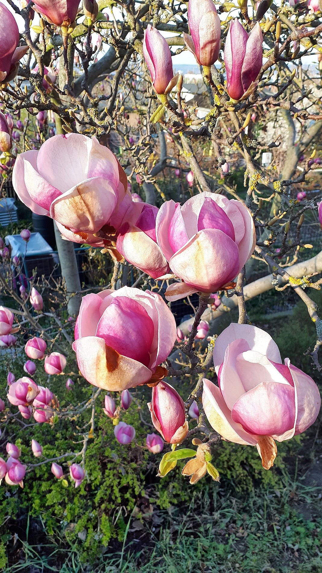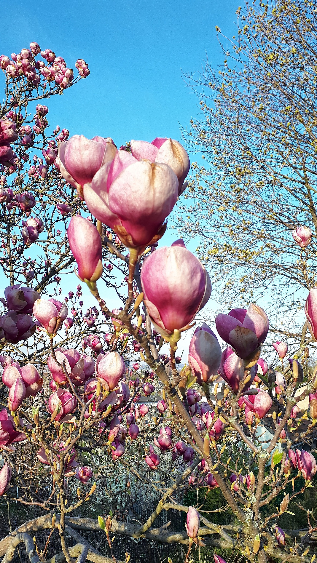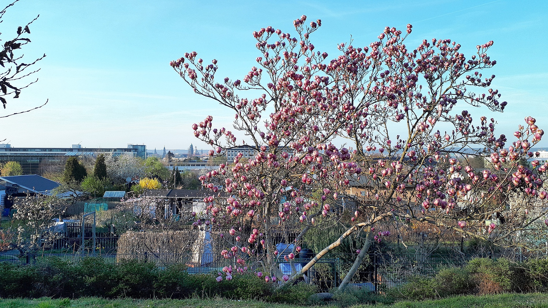 Der Frühling ist noch nicht so richtig ausgebrochen, es grünt nur zaghaft. Wie jedes Jahr stehen dafür schon die Magnolien in voller Blütenpracht.
