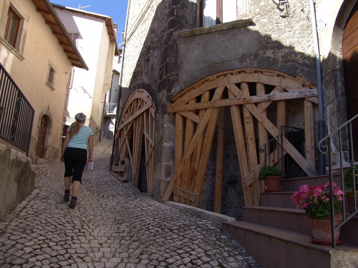 Die Narben, die das Beben 2009 hinterlies, sind allzuhäufig noch zu sehen. Stahlanker, Holzstützen und Spanngurte verhindern, dass Häuser auseinander brechen.