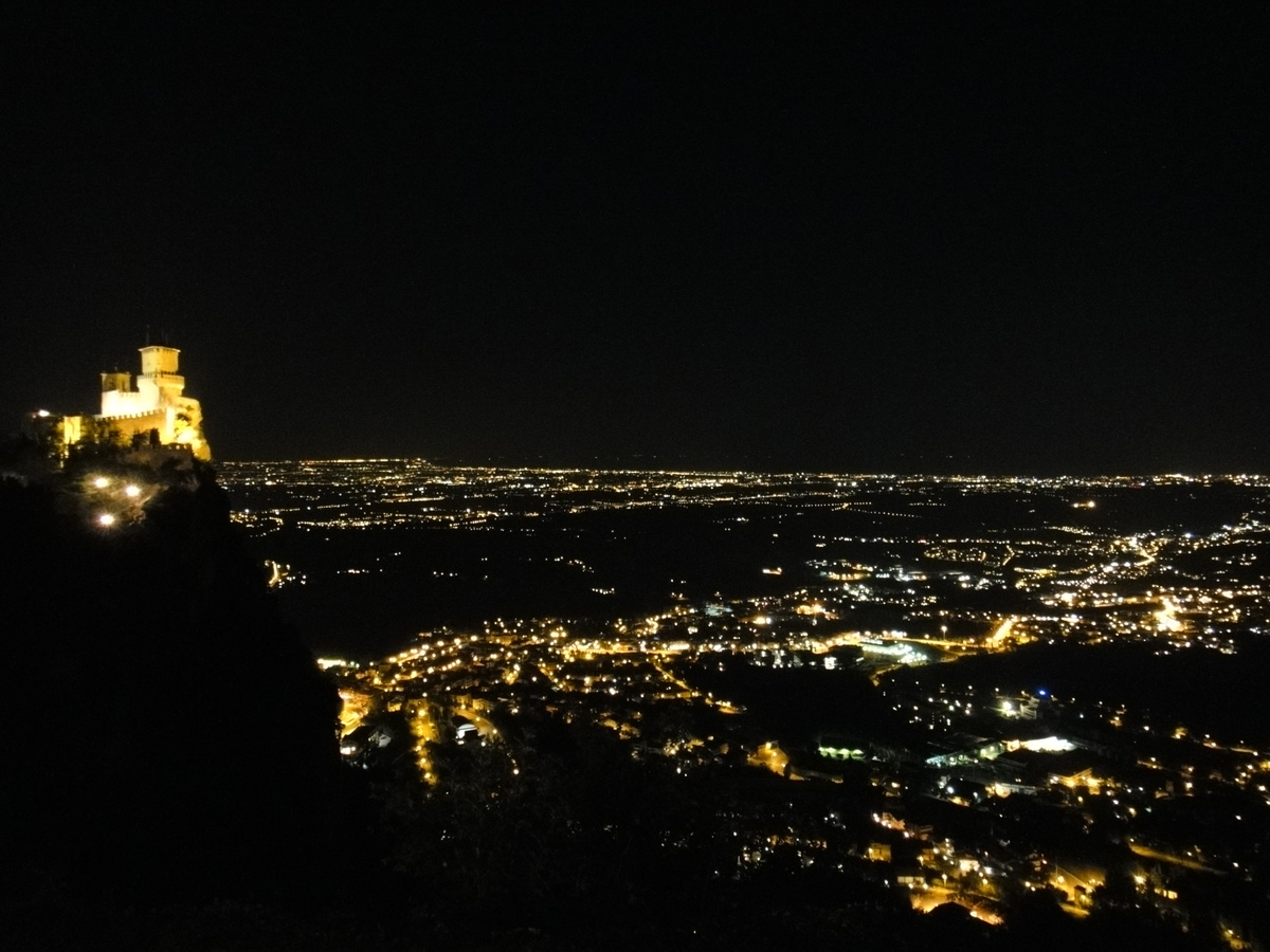 Der Blick von hier oben ist atemberaubend, das nächtliche Gefunkel erstreckt sich vom Fuß des Berges bis an die Adria-Küste.