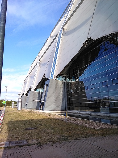 In der ehemalige Cargolifterhalle gleich zu übernachten hätte sicher seinen Reiz – zur Wahl stehen Apartments und Zelte. Aber die Preise sind uns doch etwas zu hoch. Wir entscheiden uns für den Campingplatz, dafür haben wir schließlich das Womo. Dann hab ich gleich noch die Chance zu testen, wie wir ohne Landstrom durchhalten ohne in Gefahr zu geraten, ohne Energie in der Pampa liegen zu bleiben: 280 Wp Solar auf dem Dach und eine 100 Ah-Bordbatterie sollten für unsere Bedürfnisse reichen.