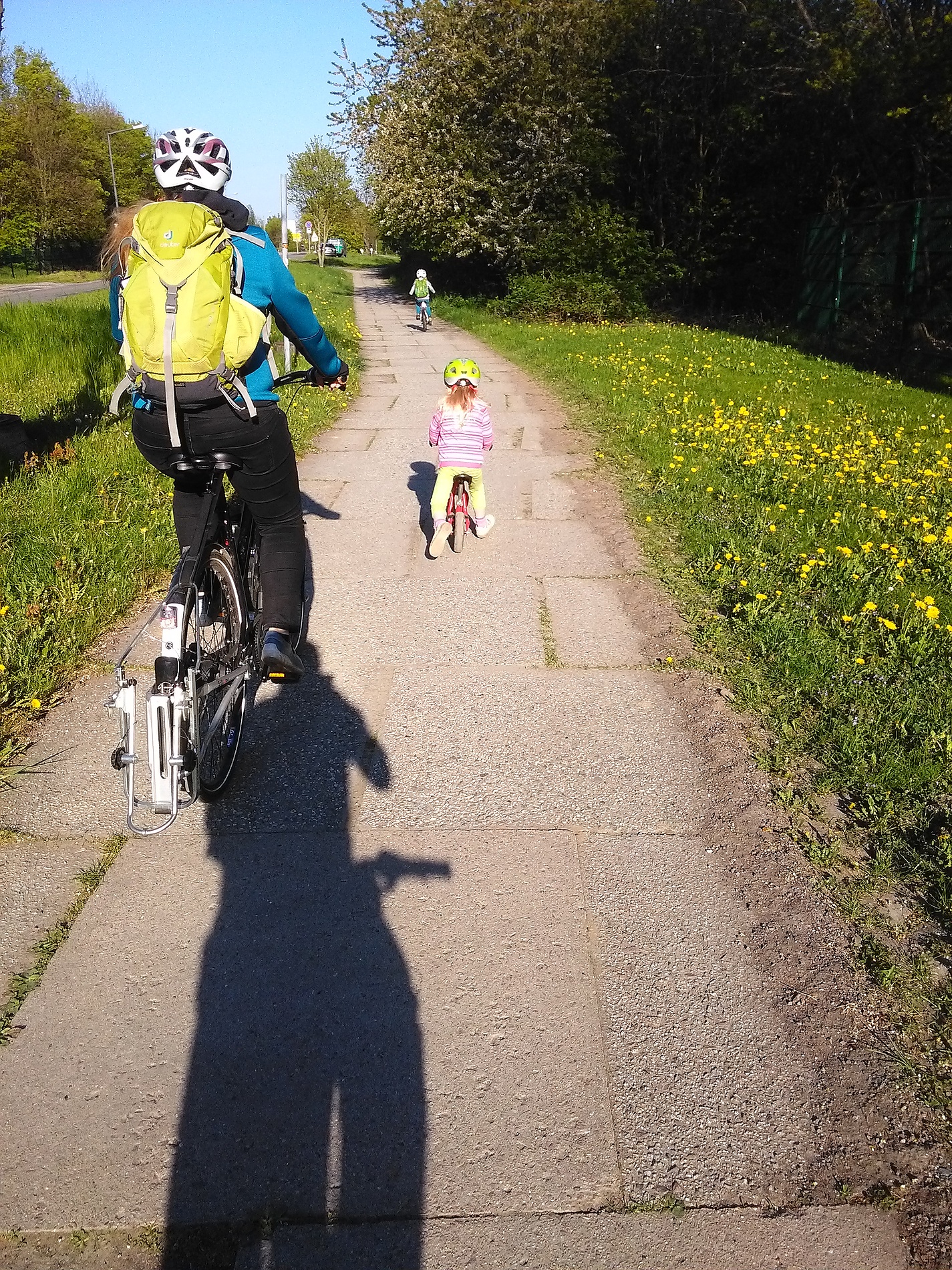 Wir haben meine Eltern besucht – was man Ostern halt so macht. Wir sind mit dem Fahrrad hin – so weit ist das nicht. Der Weg über Kohlenstraße und die Halde hoch nach Cunnersdorf ist knapp 6 km lang. Herausfordernder sind die 100 Höhenmeter. Janni sitzt bei mir im Chariot, das Laufrad oben drauf. Maria hat zur Not noch das FollowMe für Alina dabei. Die ist aber scheints vom Ehrgeiz gepackt und will auch nicht am steilsten Anstieg angehängt werden. Oben in Cunnersdorf will auch Jannika raus und ihr Laufrad haben. Meinetwegen.