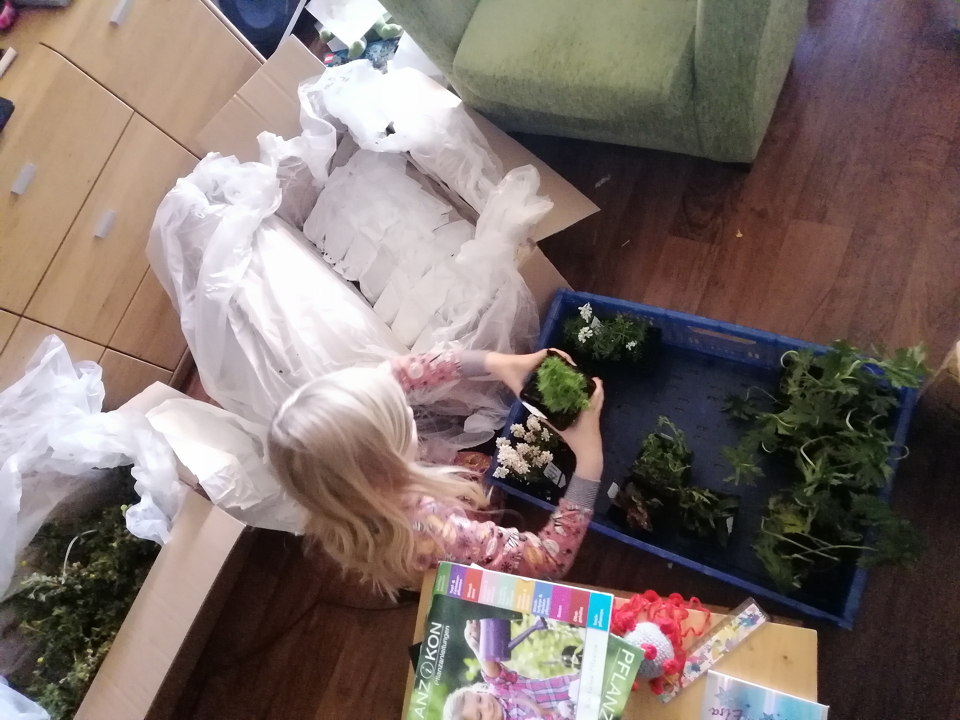 Alina hilft beim Auspacken, sie ist schon Feuer und Flamme fürs pflanzen.