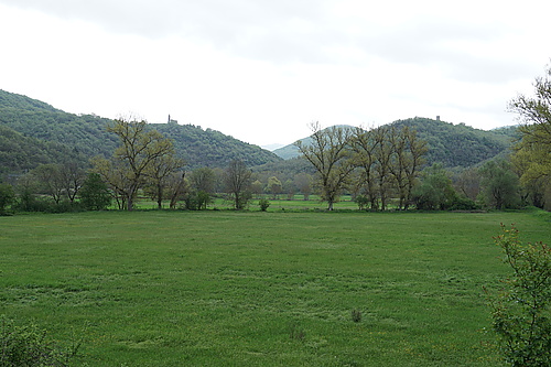 Unten aus dem Aterno-Tal werfen wir einen letzten Blick zurück, links Beffi, rechts der Wehrturm von Goriano Valli.