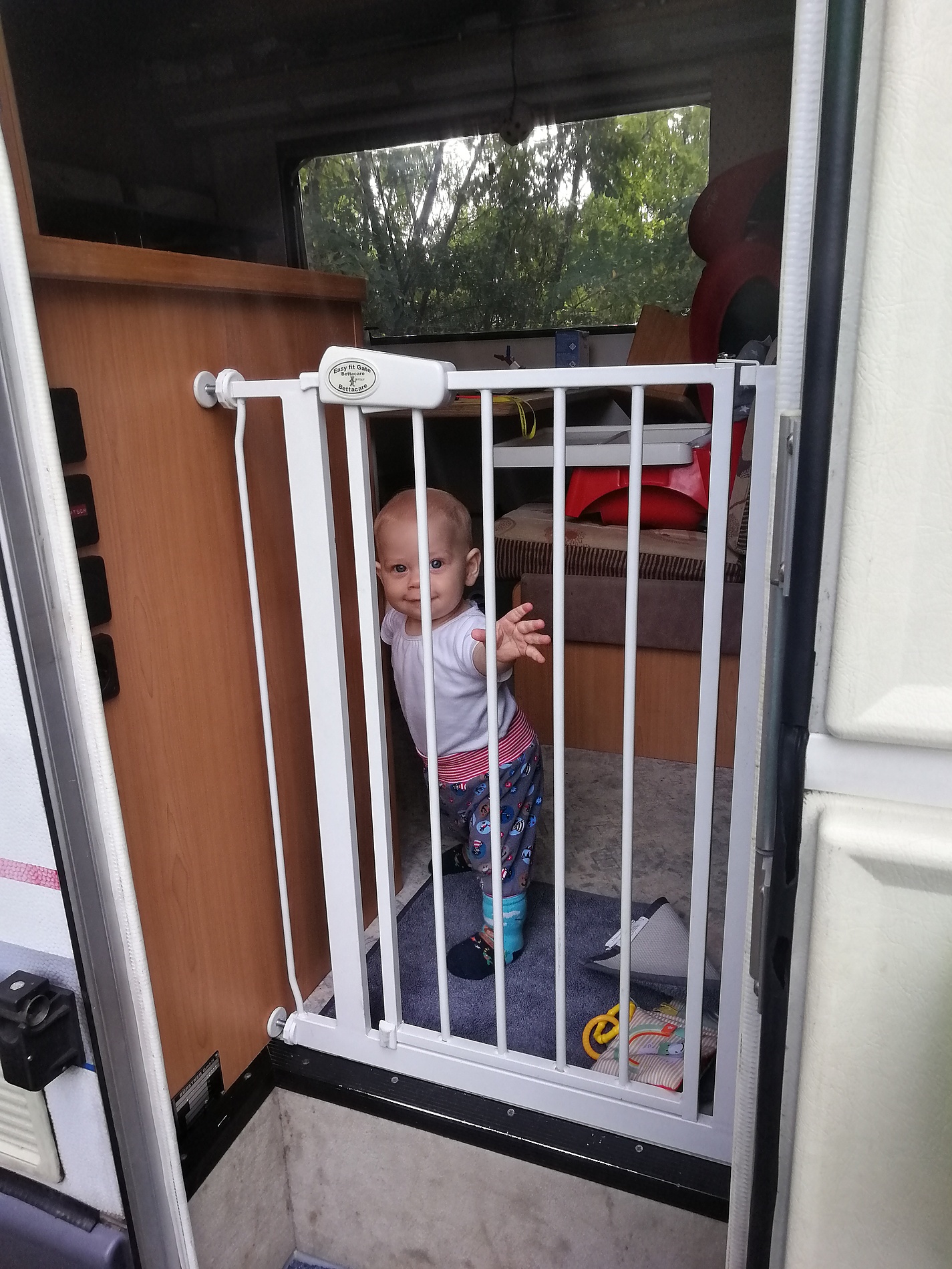 Die Vorbereitungen für unseren einwöchigen Harzurlaub schreiten voran. Mal abgesehen vom zusammenpacken aller Notwendigkeiten von Klamotten über Verpflegung bis Wander- und Schlechtwetter-Alternativ-Ausrüstung muss Mika besonders Berücksichtigung finden. Am Alkovenbett haben wir neue Netze angebracht, dass Mika nicht runterfallen kann, wenn er unbemerkt von einem Schläfchen aufwacht. Und damit er unten im Wohnmobil rumpanseln kann, haben wir noch ein Treppengitter für die Aufbautür besorgt.