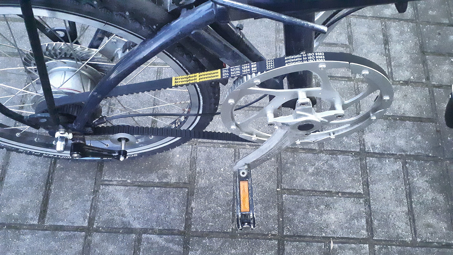Ganz klammheimlich hab ich das von mir umgerüstete Bernds wieder außer Betrieb gesetzt. Maria ist inzwischen mit meinem Strida unterwegs gewesen; Es gefällt ihr inzwischen besser und an die ungewöhnliche Sitzposition hat sie sich gewöhnt. Der Grund für den Wechsel war recht banal: Der von mir beschaffte PU-Zahnriemen hat am Bernds nicht sehr lang durchgehalten. Zwar war der Zugstrang aus Aramid, der Riemen selbst ist aber Meterware gewesen, also mit den Enden verschweißt. An der Stelle ist der Riemen trotzdem nicht so stabil; dort reißt er dann gern.
